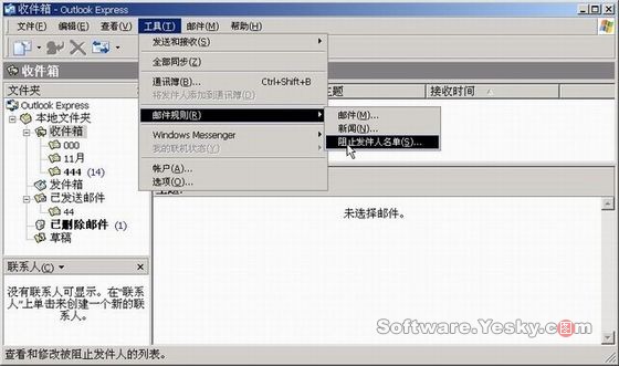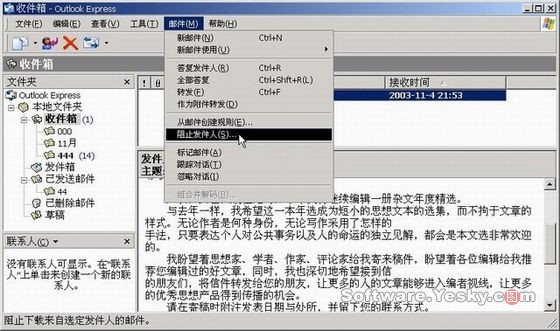 直接在“收件箱”选择要删除的垃圾邮件,然后在“邮件”下拉命令条中选择“阻止发件人”。