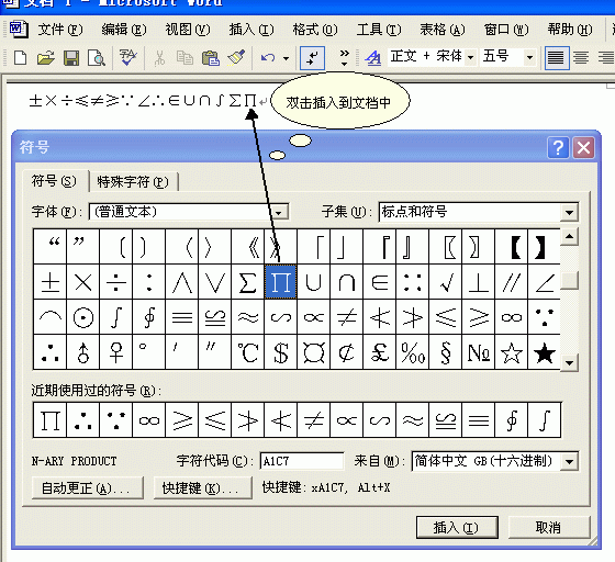 在菜单栏上选择“插入→符号”命令,打开“符号”对话框,双击对话框中的数学符号,在文档中插入一些数学符号(如图1)。接下来,我们把这些符号都添加到“自动图文集”中。