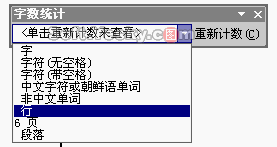 要对一个文档中的单词进行计数(还可以对文档中的字符、行、页和段落进行计数),只需点击工具条中空白域右侧的小箭头儿,从菜单中选择“单词”,该空白域就会显示出文档中的单词数。