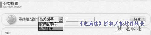 打开QQ群网址http://group.qq.com,点击“分类搜索”框的下拉按钮,选择“按关键字”进行搜索(如图1),在文本窗口中输入要搜索的关键字,如“挨踢”。