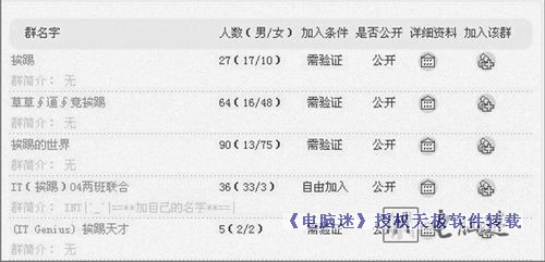 然后点击“搜索”按钮,就可以看到以“挨踢”为关键字命名的QQ群列表(如图2),在列表中列出了群名字、人数(男/女)、加入条件、是否公开等信息。