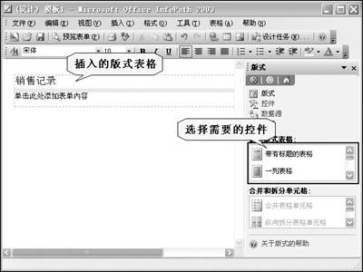 首先在任务窗格中单击“版式”设计任务,在任务窗格下面弹出一个“插入版式表格”列表,在此选择需要的表格格式。创建表单前,先要为该表单添加一个标题,在“插入版式表格”中双击“带有标题的窗格”版式即可将该窗格添加到当前的操作窗口中,或用鼠标将选中的版式拖动到指定的位置。随后在该版式中输入表单名称即可,如:“销售记录”(如图1)。如果你需要对添加的版式进行合并或拆分,可以在下面的“合并和拆分单元格”中对选定的单元格进行拆分和合并。按照上述方式我们可以添加其它的版式信息。