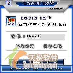 第一次运行软件时,程序会提示设置帐号库,建立访问密码,这样,以后需要登陆 LOGIN IM时,必须输入正确的密码(图1)。