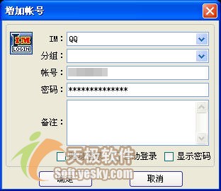 LOGIN IM的界面很简单,内容也不复杂,点击界面上的“添加帐号”按钮,在打开的窗口中选择需要添加的IM种类,输入帐号和密码,点击“确定”按钮即可完成一个帐号的添加(图2)。