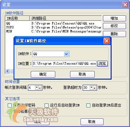 完成 IM帐号的导入后,接下来需要对IM软件的登陆路径进行正确设置,点击“导航菜单”,在弹出的菜单中选“设置”,打开“设置”窗口,点击“增加”按钮,在“设置IM软件路径”窗口中选择IM软件的种类以及正确的位置后即可(图4)。