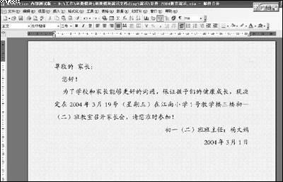 在刚才打开的永中Office的文字处理中建立一个主文档,就是给所有家长的一份通知文件。只要我们在每份通知单需要填写每位家长名字的地方留出空格就可以了(如图2)。