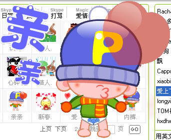 当您要向你的朋友发送魔法表情的时候双击右下角图标后,在弹出的菜单中左边选择您需要的表情,右键单击后选“预览”可以预览该表情,在右边的好友列表中选中你要发送的好友,左键单击表情,该表情就会从您好友的桌面上弹出。哈哈,当然前提是您的好友也装了 Tom-Skype 魔法表情,并运行该程序。如图: