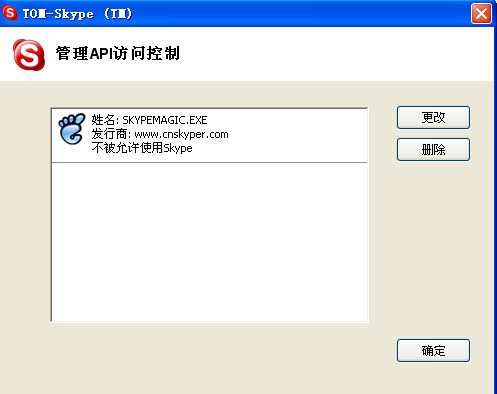 则请在 Tom-Skype 中修改设置,修改方法:工具- > 选项- > 隐私,点击“ API 访问控制”链接。在弹出的对话框中选中“ Tom-Skypem 魔法表情”点击“更改”按钮。如图: