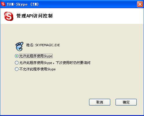 再在弹出的对话框中将 Tom-Skype 魔法表情设置为“允许此程序使用 Skype ”,如图: