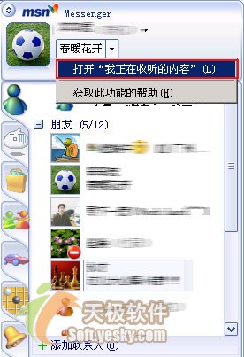 如果你正在使用Windows media player播放音乐,无论身在何处,你的好友都可以在好友列表中看到你正在收听的音乐名称,歌曲名称会在你的个人信息中显示出来(如图2所示)。当然我们也可以不让正在收听的音乐名称让好友看到,只要点击个人信息框右侧的下拉按钮,然后去除“打开我正在收听的内容”前的对号(如图3所示),这样好友就看不到我们正在收听的音乐名称了。