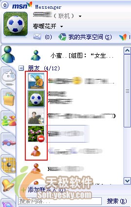 在登录MSN后,打开MSN主面板,就可以在好友ID前看到彰显个性的头像图片(如图4所示),这样就使的好友列表不再简单、单调。如果看不到好友的头像图片或是看到小的头像图片,只要依次点击“联系人-显示图片-大”菜单,就可以看到好友放大的头像图片了。