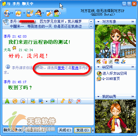 到这里, QQ的远程协助功能就介绍完了。在测试过程中,我帮助对方解决了一个用语言很不方便表述的问题,这也是它的最大方便所在。总的来说还比较令人满意,但软件拒绝双方同时申请远程协助,另外也希望在以后的版本中能够再丰富其功能,方便更多人的使用!