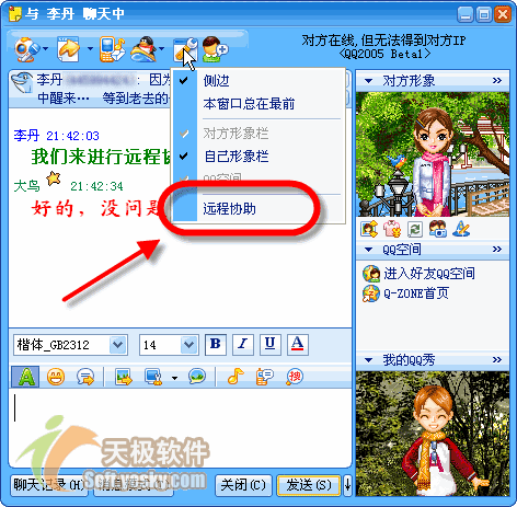 需要说明的是,这里的远程协助是请求性质的。就是说,是您发送请求,需要聊天的对方协助您完成某项任务。在后面的过程中, 对方 可以看到和操控您的电脑。为了更好的演示此功能,我使用对方发送的请求来讲解。