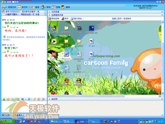 在这张图中我们可以看到,左侧部分是聊天窗口,您的正常交流不受影响;右侧分为对方形象,应用程序共享,我的 QQ秀等部分。“应用程序共享”中显示的就是对方的桌面。测试时,双方同时使用宽带,界面的变换仍有些滞后,但是却十分清晰。另外,我们还同时进行了语音聊天测试,连接十分通畅,这声图并茂的形式就为我们创造了了类似课堂演示一样的环境。