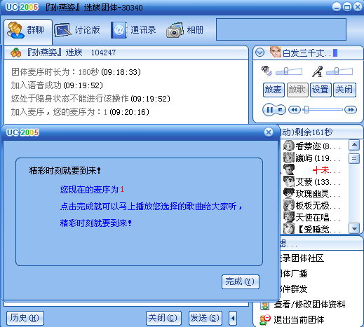 新增的“放歌”按钮,让网络会议, party 聚会,音乐共享,甚至做 NJ 主持节目,变得更加容易了。此外团体内有人语音发言或放歌的时候,团体用户可以收到浮动提示,这样就不会错听歌或聊天的机会了