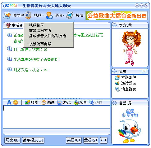 UC2005II 在语音视频功能方面得到了很大的加强,除 语音电话和视频电话可以分开使用,增加给对方播放影音文件等一系列非常人性化的辅助功能外。最关键的语音通话质量更得到了大幅度的提升!