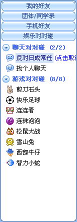 由于还在内部测试阶段,因此“游戏对对碰”下只有连连看,快乐足球等 8 款聊天休闲游戏, “聊天对对碰”下也只有“反对日本成为常任理事国”“找人聊天”两个话题,相信正式推出的时候,游戏和话题都会大大增多。