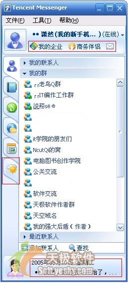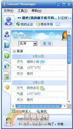 登陆后,呈现在你眼前的将是TM2005全新并且简洁实用的主界面。主界面主要为淡蓝色风格,在视觉上显得更加清新,“我的企业”、“商务伴侣”与邮箱这些商务办公类的功能则显示在主界面上方,更加体现出了TM是一款针对于办公一族的即时通讯工具。在主界面左侧增加了“天气预报”功能,用户可通过该功能在线查看气象信息以方便出行。在主界面的最下端的日历与贴身提示的信息则是出自TM小秘书的杰作,TM小秘书在新版中已更加人性化的方式出现在了TM的主界面中(如图)。