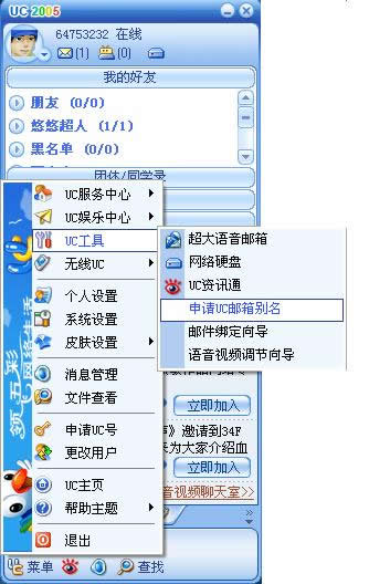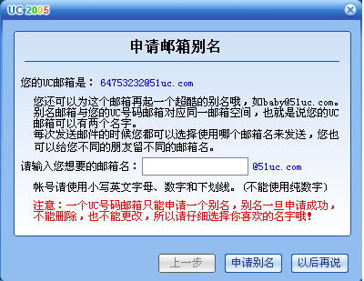 个性邮箱名与UC号码邮箱名对应同一个邮箱空间,每次发送邮件的时候你都可以选择使用那个邮箱名来发送,你也可以给不同的朋友留不同的邮箱名。打开UC菜单,选择UC工具,再选择申请UC邮箱别名,你就可以进行个性进行个性邮箱名的申请了。