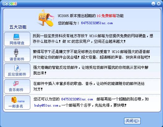 从2005版本起,UC的免费信箱@51UC.COM从百兆一下子扩容到了1G!!