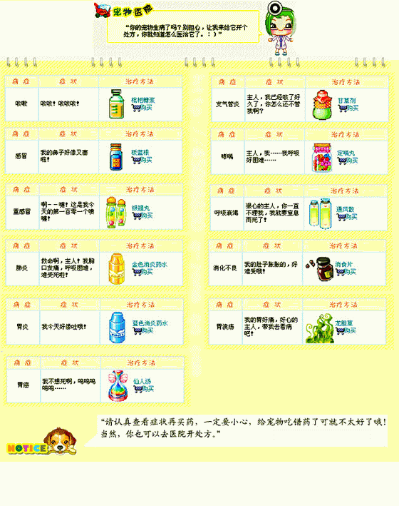 ·如果你的宠物状况处于“好痒”+“有点饿”的时候,宠物就会开始“不舒服”,此时,宠物的饥饿值是小于720点,卫生值可以到小于1080点。请马上去买药(不看医生直接买药),不舒服的药是20元,吃了药之后,你的饥饿值会变成1080点,卫生值会变成1800点。