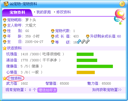 宠物个性参数包括武力值、智慧值、魅力值、天赋值等,标识宠物个性化发展。