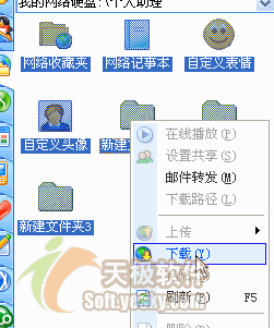 有时候,我们想在更好看的皮肤,更好看的QQ表情和腾讯的一些软件,如TT浏览器迷你游戏等等而到处搜索。其实QQ网络硬盘中的”公共资源”的公共资源已经为我们提供好了。我们打开网络硬盘中的公共资源后,找到想要的资源点击右键就可以轻松下载了。如图四所示