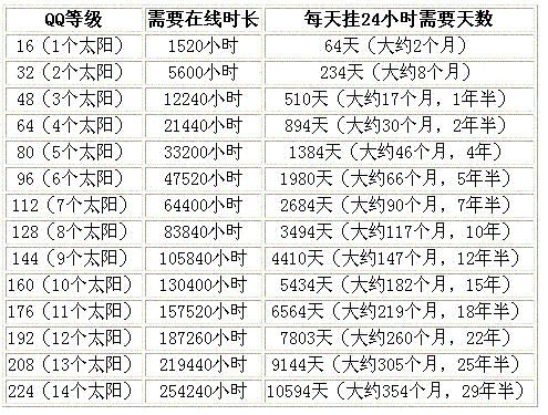 但是笔者在这里统计的一些数字恐怕会让挂机的用户大跌眼镜。达到16级才能拥有一个太阳而享受会员的服务,而获得一个太阳需要的在线时长是1520小时(如图4)。如果用户是在网吧上网,折中按1.5元/小时的上网费用,仅仅挂机到16级就需要付出15201.5=2280元的网费,而腾讯的会员会费为10元/月,这样算下来2280元可以使用228个月即19年!而1520小时换算为天数仅为63天,也就是说2个月的时间可以诞生一个使用会员服务的用户,而这个用户却需要在这2个月里付出近20年的会员费用。