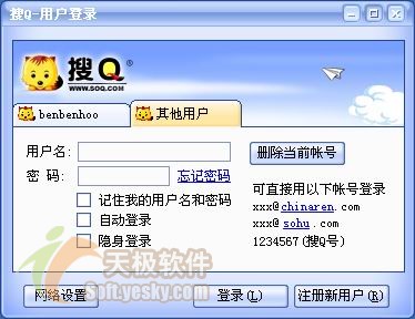 下载安装后搜Q后,双击桌面上的快捷方式,就可以看到搜Q的登录窗口(如图1所示),可以使用chinaren、sohu、搜Q号中的任意一个号码登录搜Q。