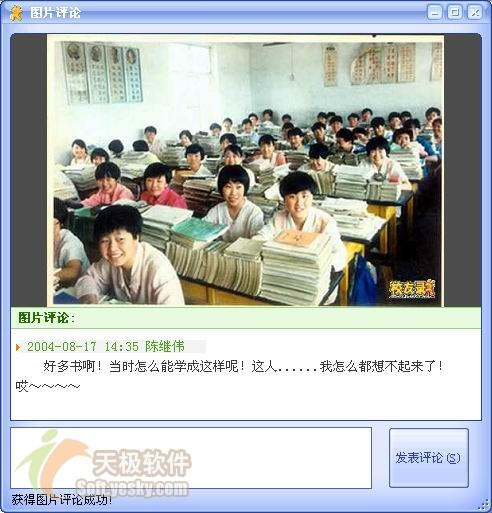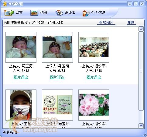 昔日的同学时的照片或是毕业照是非常珍贵的,我们可以把这些回忆上传到校友录相册,与其它同学共享。点击查看留言窗口上面的“相册”按钮,就可以看到所有上传的相片了(如图10所示),双击任一相片,就能够把相片放大,同时还可以浏览相片评论(如图11)。我们也可以上传相片,只要点击“添加相片”按钮。然后选择本地硬盘上的相片文件,最后点击“上载”就可以了。