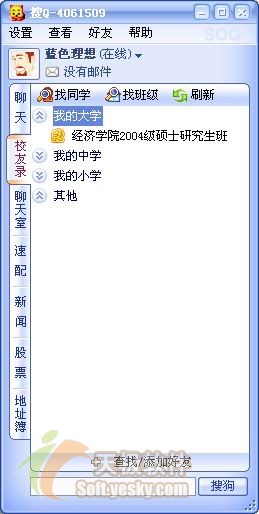 从上面的功能介绍可以看出,搜Q的确是一款非常不错的校友录辅助工具,通过使用该软件,可以随时随地的与同学们进行交流。另外搜Q除了上面介绍的功能外,还具有聊天室、好友速配、新闻、股票等实用功能,这样与同学们交流的同时还可以查看最近的热门新闻,或是一边炒股一边进行交流。不过唯一遗憾的是,搜Q现在只支持Chinaren校友录,还不支持其它的校友录,如果能够全面支持其它校友录的话,相信会受到更多朋友的支持。 阅读关于 搜Q 校友录 即时通讯 的全部文章 阅读关于 搜Q 校友录 即时通讯软件 的全部文章