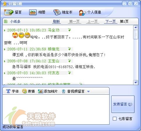 双击想要查看留言的校友录,这时就会弹出一个窗口(如图7所示),在上面的窗口里可以看到同学们以前的所有留言。如果想要给同学们留言的话,只要在下面的窗口中输入留言内容,然后点击“发表留言”按钮就可以了,在编辑留言内容的时候,可以点击文本输入框上方的字体与表情按钮,在留言内容中插入形象可爱的表情符号。