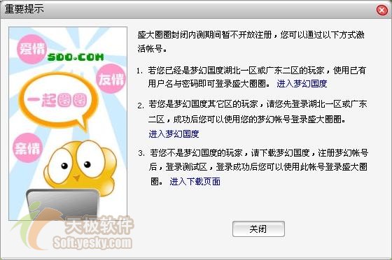 由于目前圈圈处在封闭内测期间暂时不开放注册,所以点击“注册”按钮后看到的不是注册向导,而是一个提示窗口(如图5),用户必须拥有盛大旗下的网络游戏《梦幻国度》的帐号,并登录特定区后才能使用盛大圈圈。这样的行为,多少会有点捆绑的嫌疑喔。