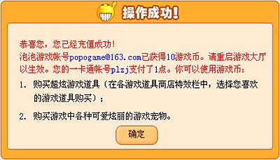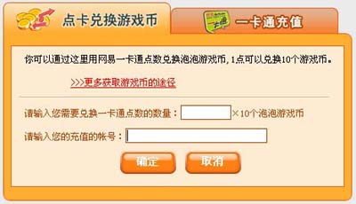 泡泡游戏于2005年8月10日正式开通充值服务!充值服务包括了一卡通兑换游戏币以及钻石玩家注册充值两部分。在服务开通后,玩家们就可以利用网易一卡通点卡来进行泡泡游戏币的兑换及钻石玩家的注册充值。游戏币充值与钻石玩家充值的页面分别如下: