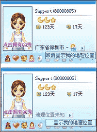 答:“共享地理位置”是腾讯公司即将推出的QQ 2005 Beta3里新增加的功能,它们是指:当用户自愿选用“共享地理位置”功能后,就可以让自己的好友可以在自己的头像tips(即用户提示)里看到自己所在城市的具体名称。