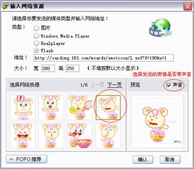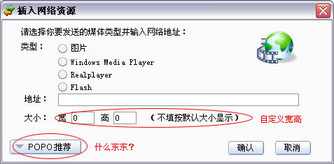 细心的用户可能还会发现,此时网络资源的“类型”自动选择了“Flash”,宽高也按网易POPO推荐的大小帮用户填好,的确考虑周到。