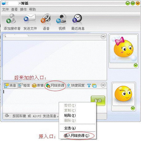 “网络资源”是指网络上的图片、音乐、视频、flash等多媒体资源。“发送网络资源”,就是不需下载这些资源,而直接将他们发送给好友,发到群里。好友收到后可以直接在对话窗口中播放(图1)。这是一个独特而好用的功能。