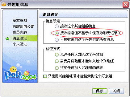 对于兴趣组的消息,笔者觉得来一条消息就弹一条很骚扰。在POPO的兴趣组消息设定中有“接收消息但不显示”的设置(图7),设置后就不自动弹出消息,只在兴趣组名字后面显示未读消息条数,打开兴趣组聊天窗口则可以显示未读消息。