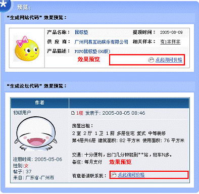 访问网站( http://i.popo.163.com/wztd )我们可以看到细致的介绍和flash演示。而简单的说就是:您可以为您的POPO生成一段代码,然后将这段代码发布到网页或论坛。其他人点击页面上的提示(如下图5就是“点此询问价格”)就可以发消息到您的POPO上: