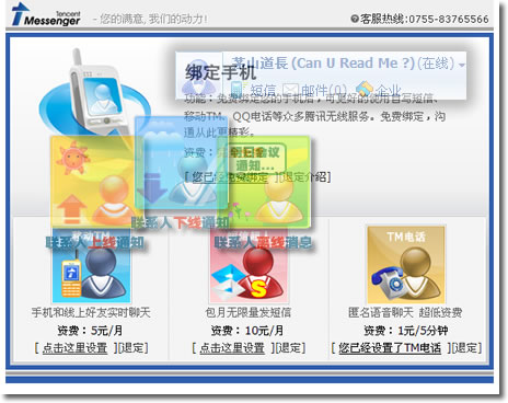 你是否有许多信息要处理?经常离开电脑而又需要及时接收信息可能是个矛盾,但是在TM2005正式版中,及时的信息也不必在电脑上收到了。利用移动TM,联系人可以随时联系到你。开通短信超人,无限量发送短信。以前在QQ上才能享受的服务,在TM2005上实现了!