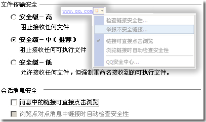 现在TM2005正式版可以彻底解决这个问题,TM设置中,新增了“安全设置”栏目,可以对文件传输和消息中的链接进行控制,安全级别从高级的“阻止接收文件”,到低级的“强制重命名收到的可执行文件”,都会让你有十足的安全感。整合了腾讯安全中心的TM2005正式版,对于消息中的超链接也处理的相当好,发现有害链接,你随时都可以举报到安全中心。当然,如果你也可以不理会这些链接,将“消息中的链接可直接点击浏览”前的对号去掉,彻底安心。