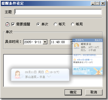 如果你经常变更工作地点,天南海北,天气会是你最关心的问题。TM2005正式版强化了“小秘书”功能,整合了腾讯气象站的小秘书,随时告诉你当前和未来24小时的天气。小秘书的备忘录功能也做了优化,你可以根据需要设置是否需要某条信息的提醒。TM2005小秘书,个性化、人性化。