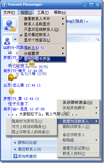 在TM2005中,你可以随意制订左侧的标签、设置树形结构、设置置顶组……甚至你还可以隐藏面板上的小秘书界面!优化的菜单结构,使你可以轻松找到需要的功能。另外,消息管理器增加了“平板模式”,查看消息更加直观!
