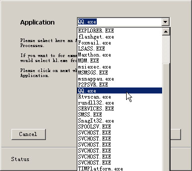 Step 1:在“Application”后的下拉列表框中选择当前正在运行的程序进程名称,例如,我们要添加一条QQ的信息,则选择“QQ.EXE”(图2),当然先需运行QQ,然后点“Next”。