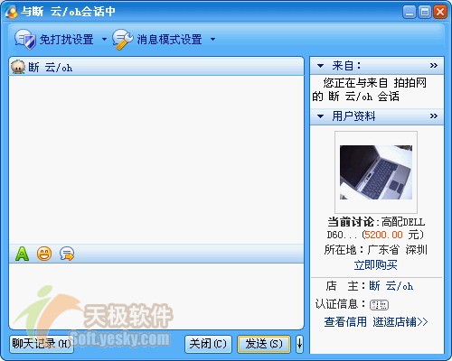 为了方便买卖双方能够方便快速的进行交流,如果卖方QQ在线的话,就会在其商品的下面有一个发亮的“与我交谈”图标,点击就会弹出QQ临时会话窗口(如图4所示),在这里就可以方便的与卖家讨论该商品的详细情况了。