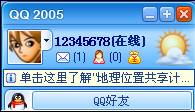 当您安装了QQ2005Beta3版本后,第一次登录时,QQ主面板上会有一个选择“共享地理位置”的提示,显示为一个黄色的小消息条。
