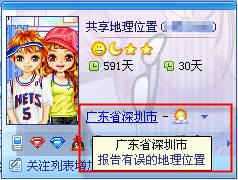 “共享地理位置和天气预报”功能是腾讯公司在QQ 2005 Beta3中推出的新功能,选用了该功能的用户可以在自己的头像tips(即用户提示)里看到自己所处城市名称和天气预报,同时也可以在自己的头像tips里,看到其它选用了这个功能的好友所处的城市名称和天气预报。