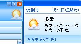 在主面板的右上角会出现您所在城市的天气状况大图标,鼠标移上后可以看到您的地理位置信息和当天的天气情况,点“查看更多天气预报”可以查看更详细的天气预报。