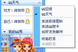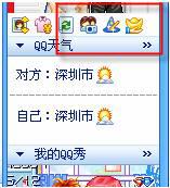 彼此都选用了“共享地理位置和天气预报”功能的QQ好友,在交谈时,还可以在对话窗口右侧QQ秀下方的空白栏目区内自动显示彼此所在城市的名称和天气预报。如果对方有Q-Zone,系统自动显示的是Q-Zone信息,而不是地理位置和天气预报的信息,但是,如果您希望该位置显示地理位置和天气预报信息,您可在该位置将其手工设置为显示地理位置和天气预报信息。
