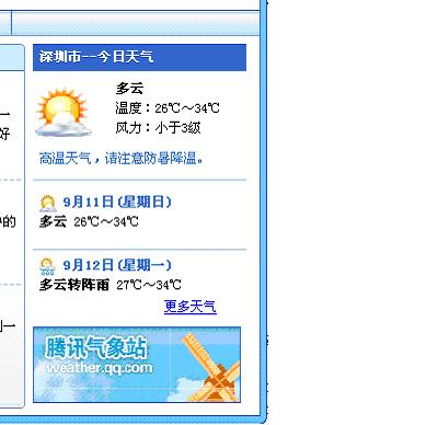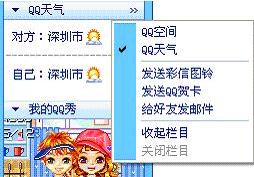 彼此都选用了“共享地理位置和天气预报”功能的QQ好友,在交谈时,还可以在对话窗口右侧QQ秀下方的空白栏目区内自动显示彼此所在城市的名称和天气预报。如果对方有Q-Zone,系统自动显示的是Q-Zone信息,而不是地理位置和天气预报的信息,但是,如果您希望该位置显示地理位置和天气预报信息,您可在该位置将其手工设置为显示地理位置和天气预报信息。